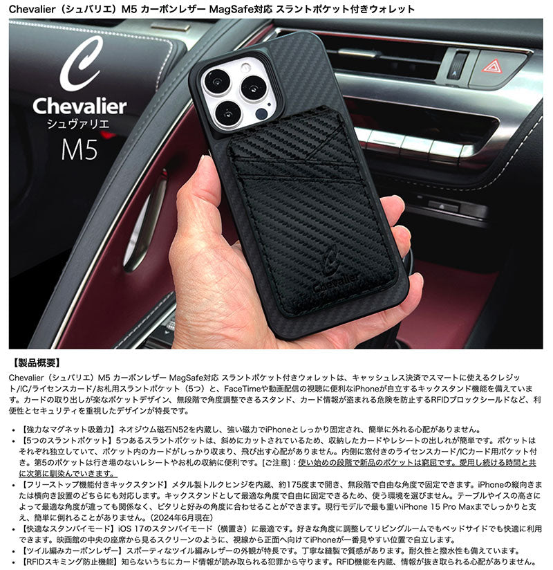 Chevalier(シュバリエ)M5 カーボンレザー MagSafe対応 スラントポケット付きウォレットは、キャッシュレス決済でスマートに使えるクレジット/IC/ライセンスカード/お札用スラントポケット(5つ)と、FaceTimeや動画配信の視聴に便利なiPhoneが自立するキックスタンド機能を備えています。