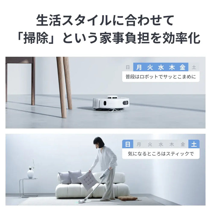 家具の上や窓枠、階段などロボットでは届かない場所や、週末の細やかな掃除にはスティックを。