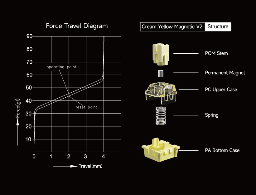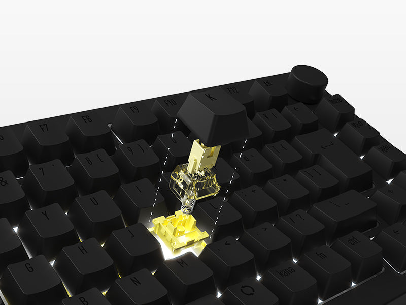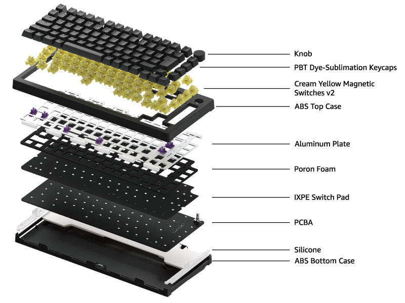「第2世代 Akko Cream Yellow Magnetic Swticth」スイッチを搭載。 第1世代のスイッチより磁束が大幅に向上。 これによりアクチュエーションポイントとラピッドトリガーの両方を最短 0.1mmに設定することが可能に。 また、スイッチ動作の安定性も大幅に上昇しています。 FPSゲームにおいて高速&安定した操作が可能なスイッチです。