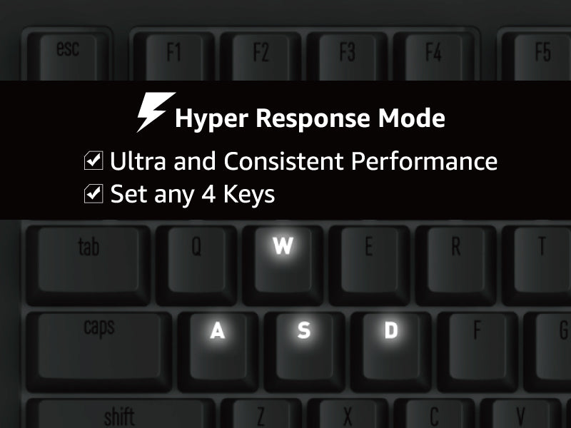 ハイパーレスポンスモードは、最大4つのキーの入力速度を最適化できる モードです。(専用ドライバにて設定可能) 1LEDライトをオフ 2指定されたキーにMCUリソースを集中 この2点によってキーのスキャンスピードを最適化し、 キー入力を安定して高速化します。 8000Hzポーリングレート+Hyper Response Modeの 組み合わせにより、安定した超高速入力が可能になります。 ※FPSゲームをプレイする場合「WASD」の4キーに設定 することを推奨します。