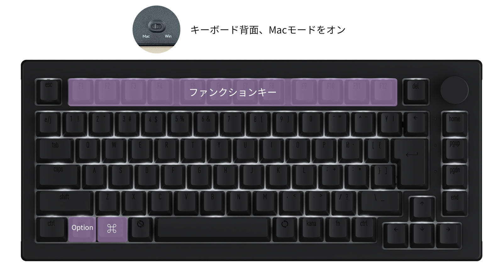キーボード背面にあるボタンスイッチをMacにし、USB接続する事で、⌘cmd、Optionキー、ファンクションキーが切り替わり、macOSの標準キーボードの配列として使用可能です。