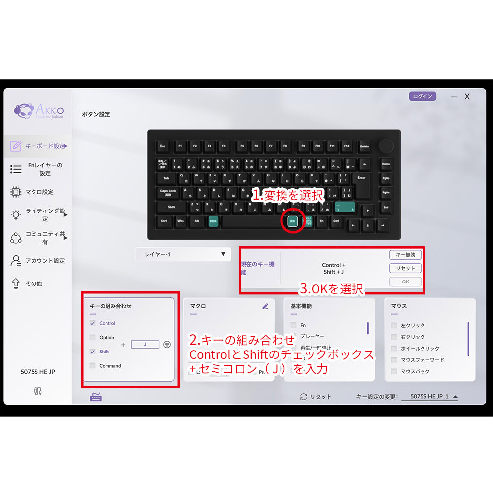 Akko Cloud Driver(Mac)ソフトウェアを使用し、かなと英数キー、⌘cmd、Shiftにショートカットキーを割り当てる事で、macOS風配列にさらに近づける事が可能になります。