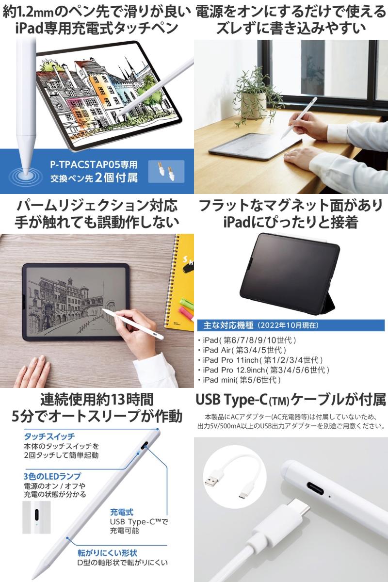 エレコム タッチペン スタイラス 充電式 iPad専用 パームリジェクション対応 磁気吸着 USB-C充電 ペン先交換可能 ホワイト