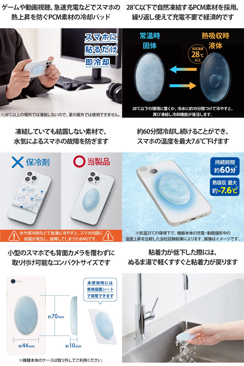 ■ 貼るだけで冷却!スマートフォンの熱上昇を防ぎ、繰り返し使えるPCM素材の冷却パッドです。
