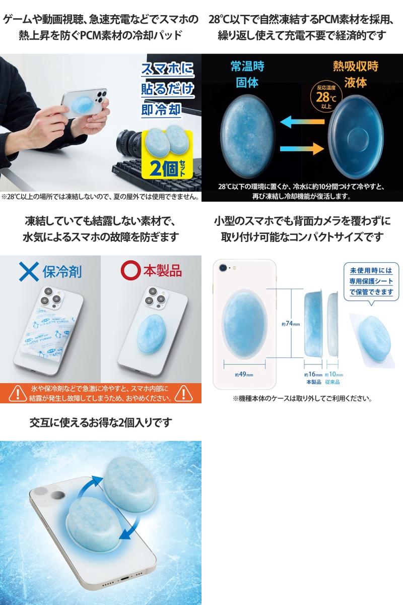 貼るだけで冷却!BIGサイズで効果時間1.5倍!スマートフォンの熱上昇を防ぎ、繰り返し使えるPCM素材の冷却パッド2個入りです。