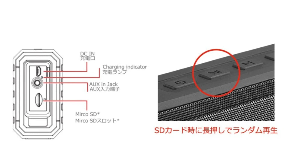 本体にマイクロSDカード(TFカード)のスロットやAUX端子を搭載しており、Bluetooth以外の入力による音楽再生も可能。