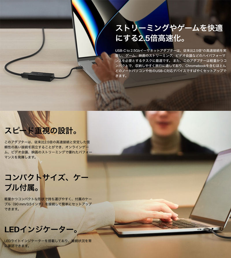 USB-C to 2.5Gbイーサネットアダプターは、従来比2.5倍の高速接続を実現し、ゲーム、映画のストリーミング、ビデオ会議などのハイパフォーマンスを必要とするタスクに最適です。