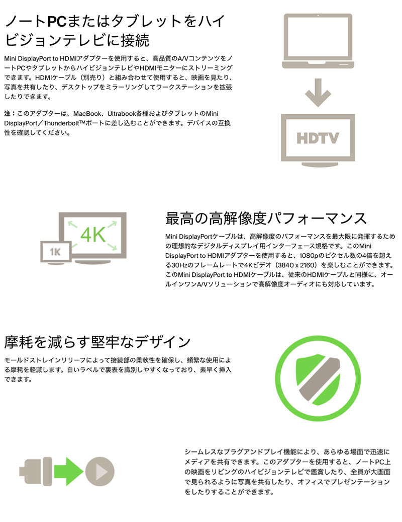 注:このアダプターは、MacBook、Ultrabook各種およびタブレットのMini DisplayPort/Thunderbolt ポートに差し込むことができます。デバイスの互換性を確認してください。