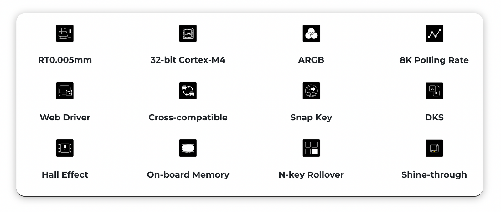 最大0.005mmの超高精度なラピッドトリガーと、0.005mm単位で調整可能なアクチュエーションポイントに対応。これにより、ユーザーはタイピングやゲームプレイ時の操作感を細かくチューニングでき、理想的なアクチュエーションを実現。応答速度と精度が向上し、競技性の高いゲームにおいても優位性を発揮します。