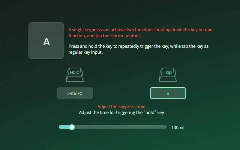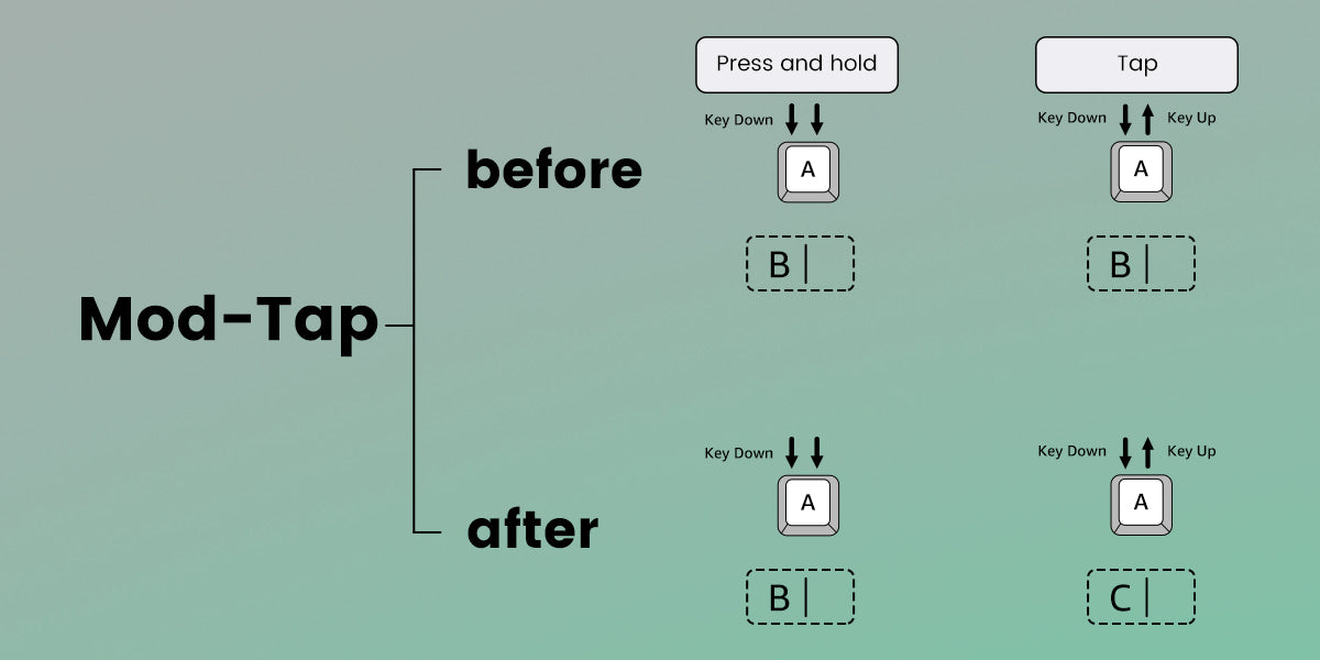 Mod Tapは、ゲームに利便性を提供する設計です。押下動作に応じて、専用またはデュアル機能のキーを作成できます。キーを1回押すと1つの機能が実行され、キーを押し続けると別の機能が動作する、2つの機能を組み合わせた操作が可能です。