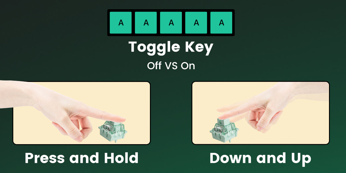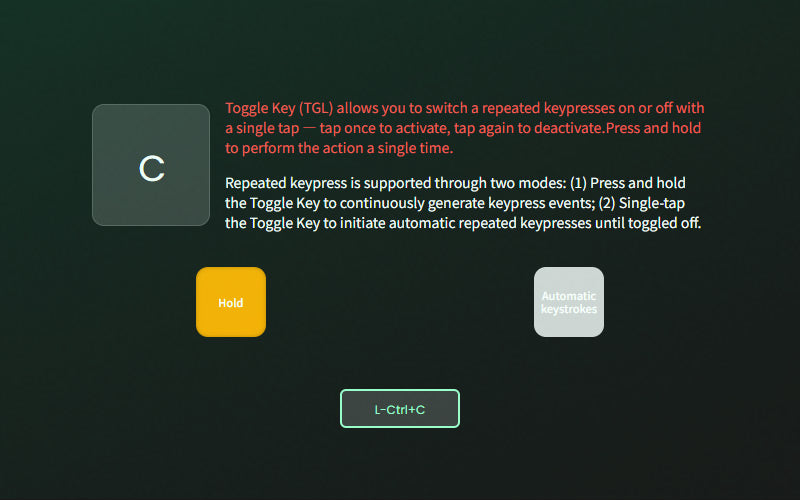 トグルキー(TGL)は、キーをトグルスイッチに変換します。このスイッチを押すことで、キーや機能を連続して押し続けるか、高速で複数回トリガーするかの2つのシナリオを選択してアクティブにできます。