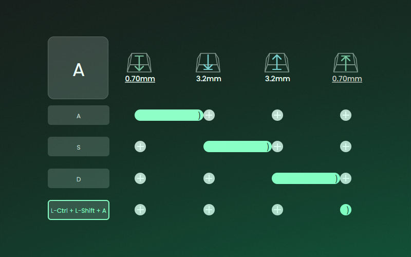 キーを押すことで、4つの異なる操作がトリガーされます。押下の強さに応じて、軽く押すとアクション1がトリガーされ、深く押すとアクション2が起動します。また、キーを離す際に2段階の設定もサポートしています。