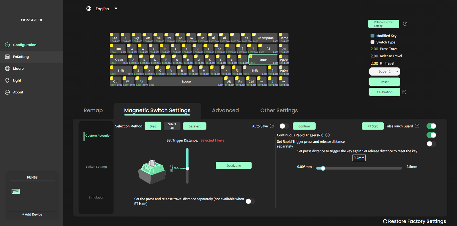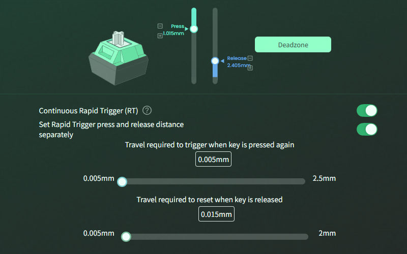 ラピッドトリガーは、キーの作動ポイントとリリースポイントを動的に変更します。MonsGeek Driverを使用すれば、ユーザーは「すべてのボタン」または「ボタンごと」にカスタマイズモードを選択し、「ノンストップラピッドトリガー」を有効化することで、ほぼ瞬時のキー応答を実現できます。これにより、FPSゲーマーはスピーディーなゲームプレイで競争力を高めることができます。