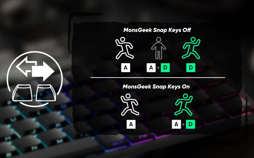 スナップキーは、MonsGeekのSOCDであり、前の入力を解除せずに最新のキープレスを優先して迅速な方向転換を可能にします。これにより、特に素早い反応と正確な操作が求められるFPSゲームにおいて、スムーズで応答性の高いコントロールを実現します。