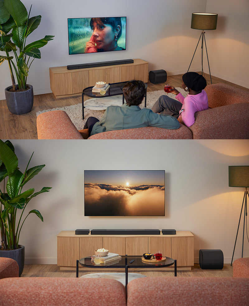 家族で大迫力のヒーロー映画を楽しむなら離れた場所に、ストリーミングサービスでロマンチックなプレイリストを楽しむなら近くに置いてください。
